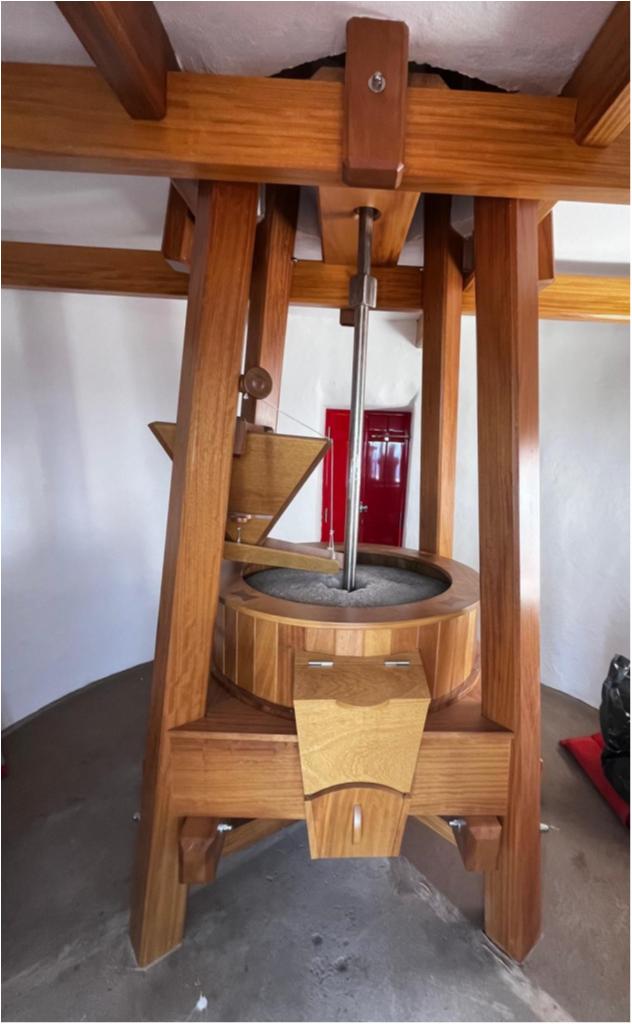 Although fixed in its location, the mill was designed to capture wind energy through its sails, once essential for transforming grains into flour. Its presence recalls a past of agricultural labor and self-sufficiency, where human ingenuity allied with natural resources to sustain the local population.